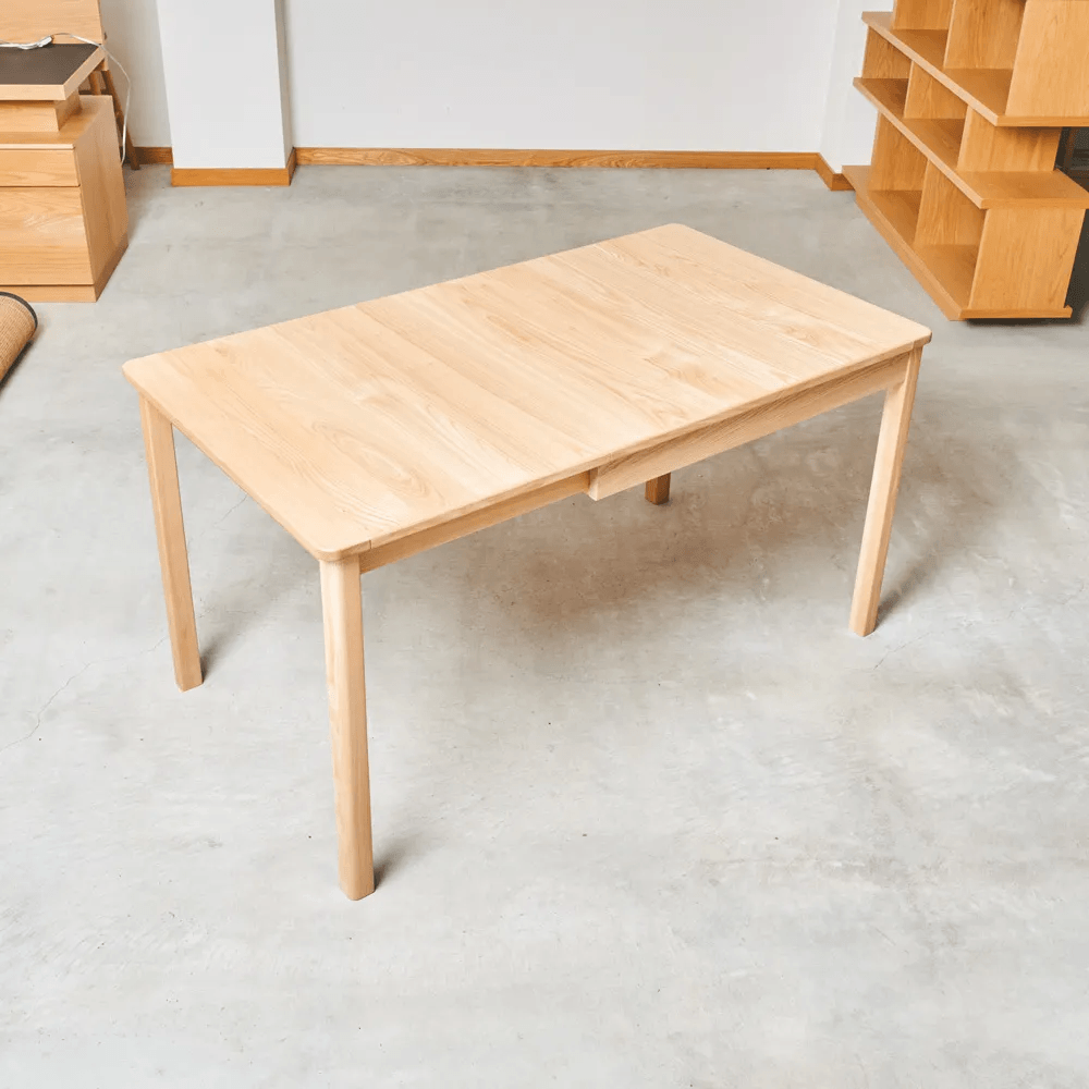 毎日の食事は縮めた状態で空間を広く保ち、来客時や作業スペースが必要な際には広々と使うといった柔軟な対応が可能です。 天板には内部を空洞にするフラッシュ構造を採用しているため、移動や配置換えが負担にならない軽量化を実現いたしました。
